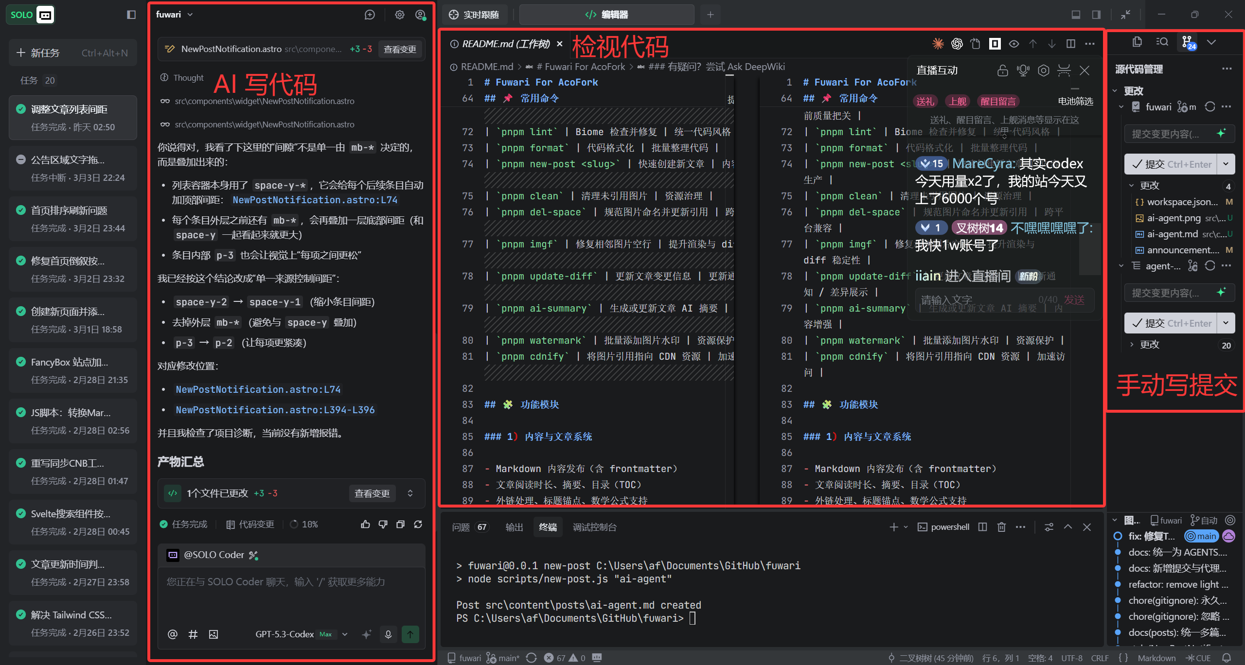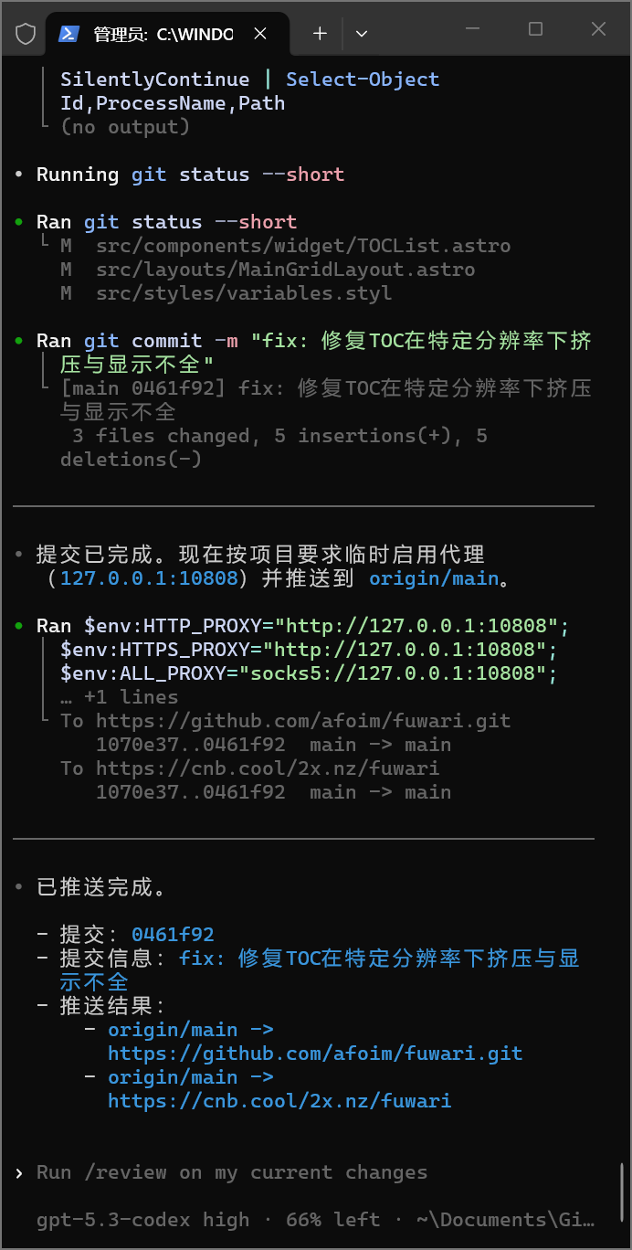 例如,我们可以把 Git 推送远程仓库这类流程交给 AI:自动生成 commit、自动配置代理、自动 push,并把本次规则和约束持久化,下次就不用重复说明。图为 Codex