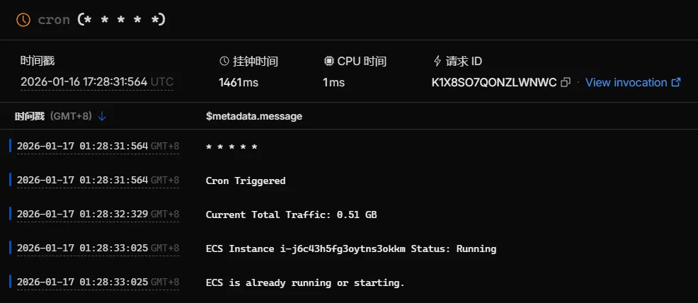 部署成功后,Cloudflare Worker将在每分钟检查一次CDT,如果超出流量阈值,会将指定ID的ECS停止