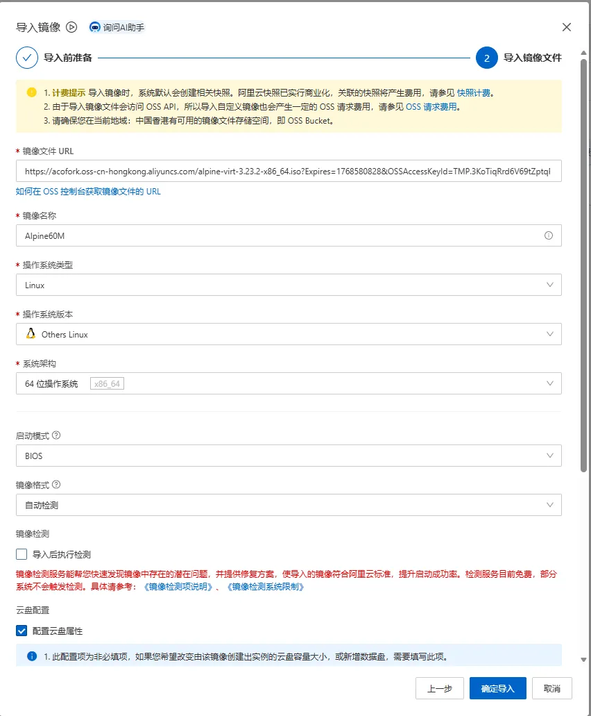 https://dl-cdn.alpinelinux.org/alpine/v3.23/releases/x86_64/alpine-virt-3.23.2-x86_64.iso将镜像上传至阿里云OSS