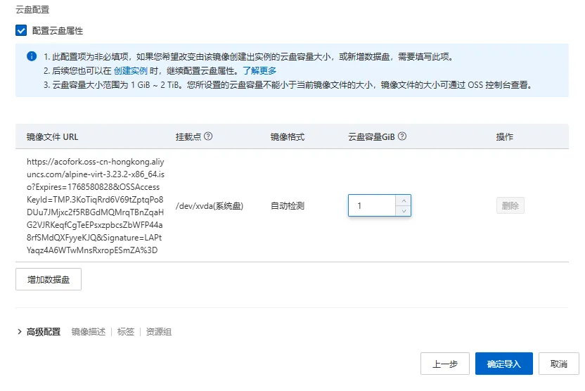 接下来勾选配置云盘属性,并且将 云盘容量设置为1GB ,确认无误,导入