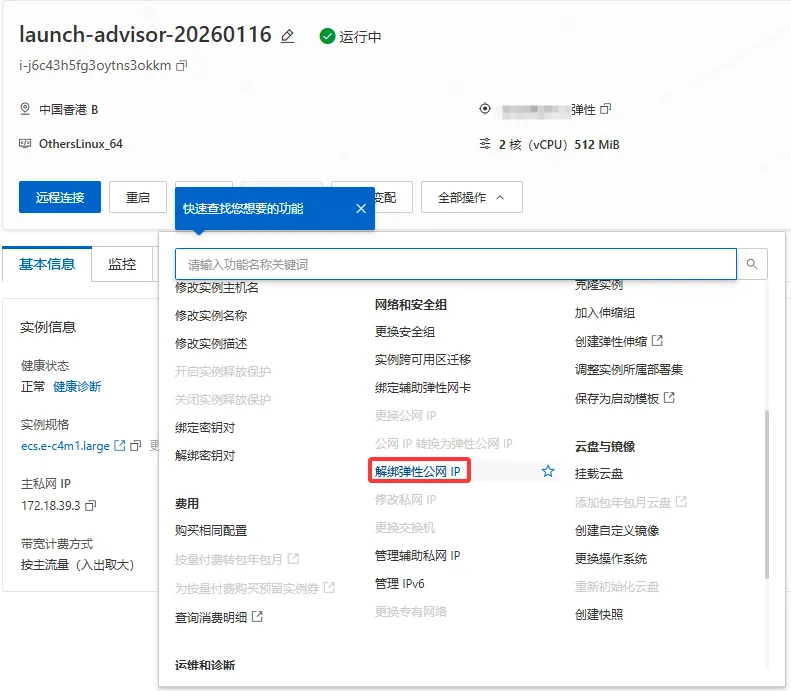 接下来绑定弹性公网IP(因为我绑定过了,所以是解绑)