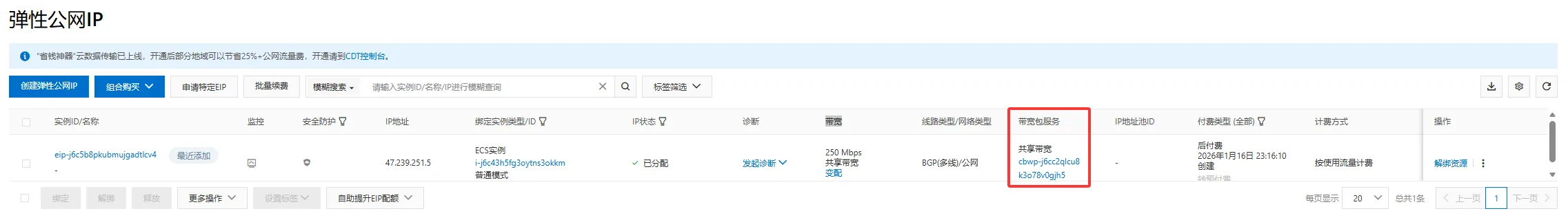 虽然我们将弹性公网IP连接了CDT,默认流量会从CDT的免费流量份额里面扣