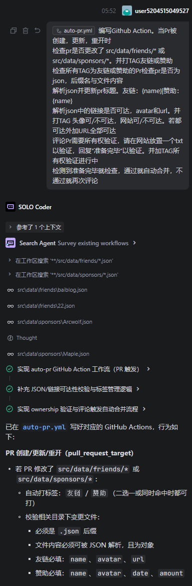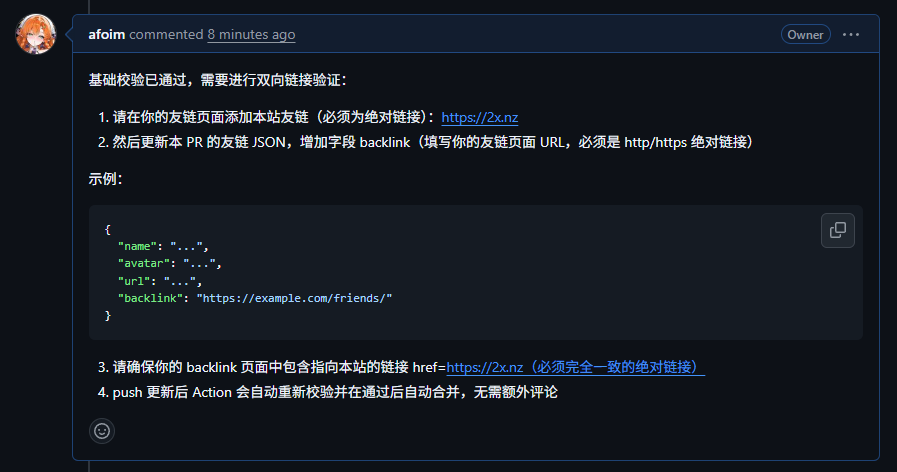 思路是这样的:让用户在提交友链时额外填写一个回链字段,然后由 GitHub Action 实际检测是否存在回链。这样不仅能确认对方确实添加了你的友链,也能顺便完成一次所有权验证。