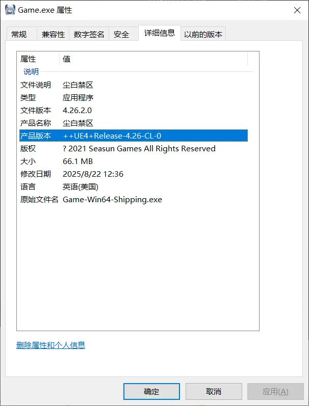 右键 Game.exe ,单击属性,转到 详细信息 一栏。可以看到是 UE4 4.26 。记住他,后文要用