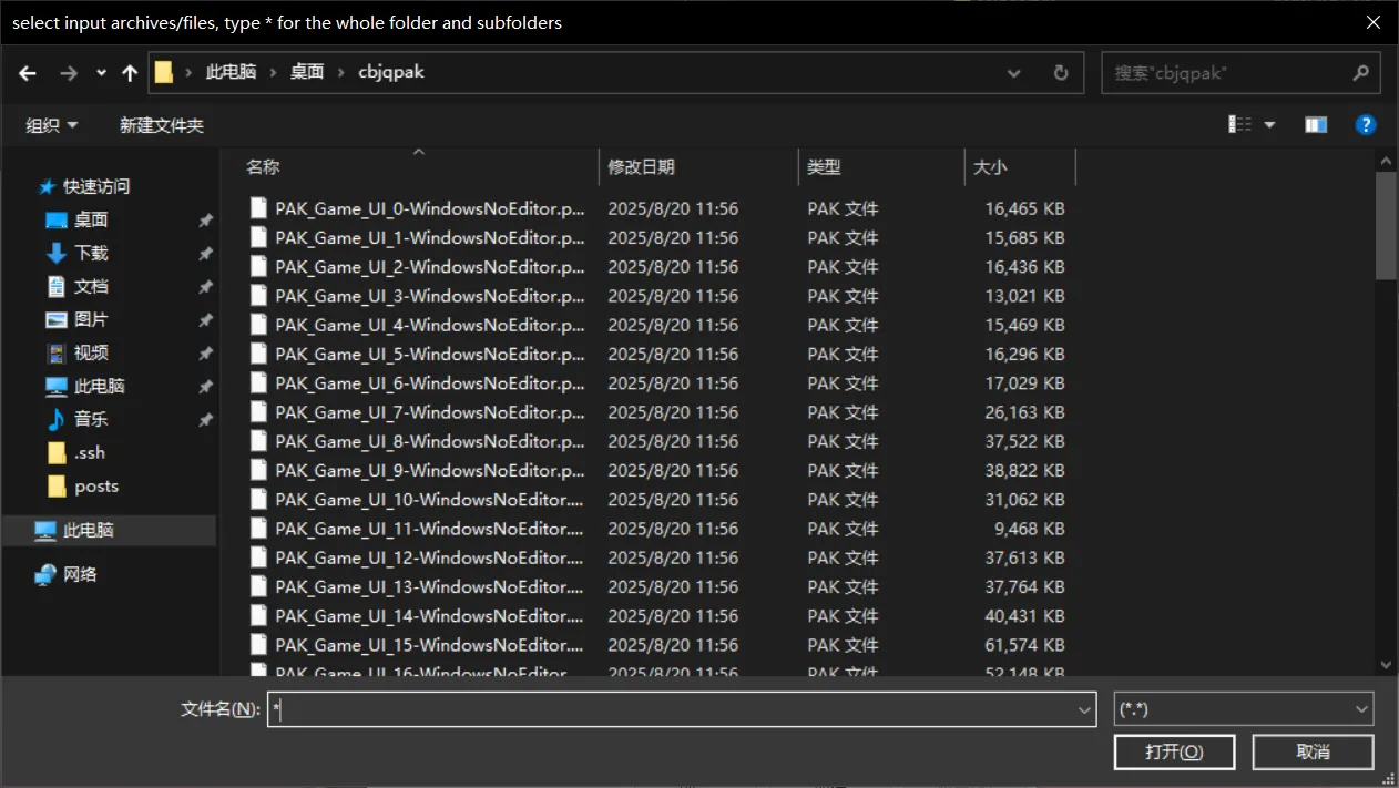 第二步 选择原始PAK文件所在的文件夹。选中文件夹后,在文件名输入 * 即可