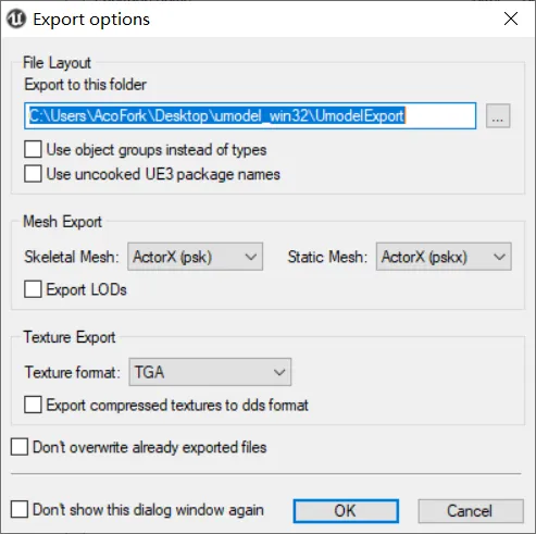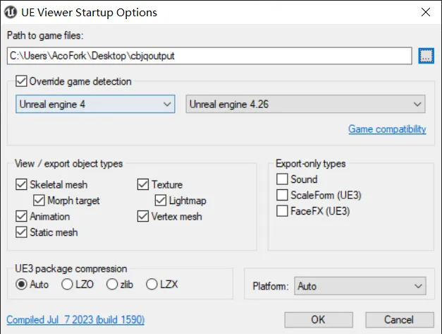 打开 umodel_64.exe 。 Path to game files: 填写通过 QuickBMS 解包后的输出文件夹,勾选 Override game detection 并选择 UE4 4.26,也就是最开始我们获取的虚幻引擎版本