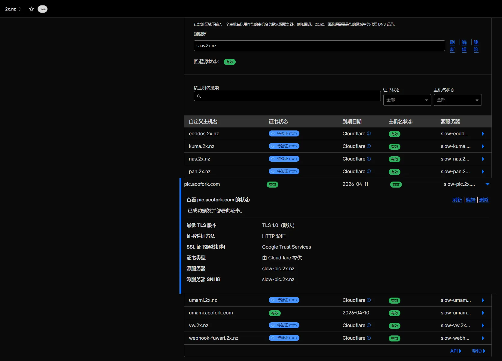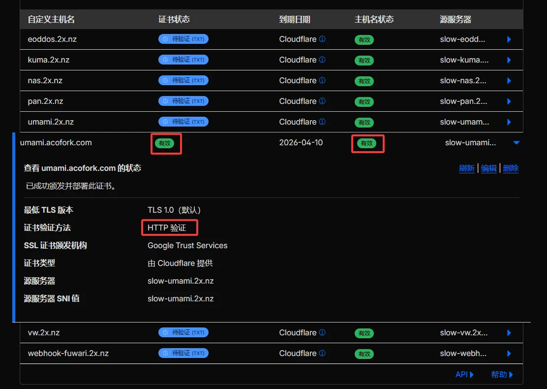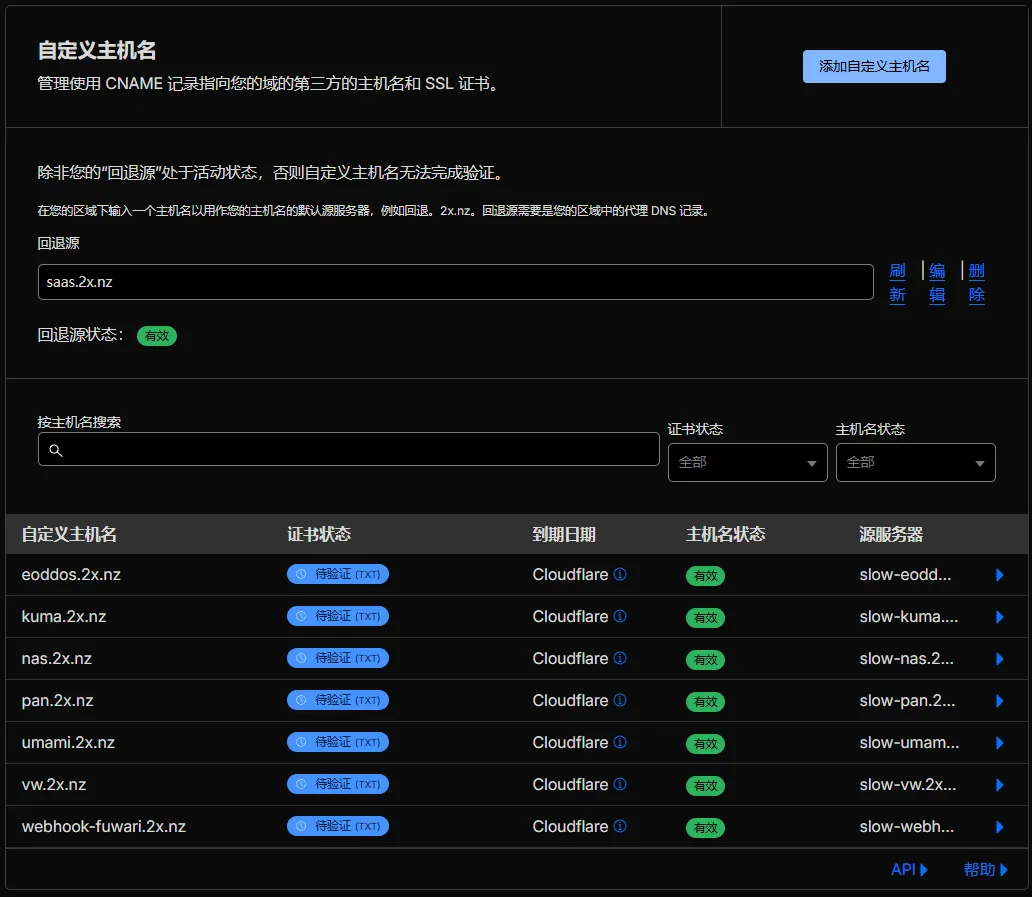 前往辅助域名的 SSL/TLS -> 自定义主机名。设置回退源为你刚才的DNS解析的域名:xlog.acofork.cn(推荐 HTTP 验证)