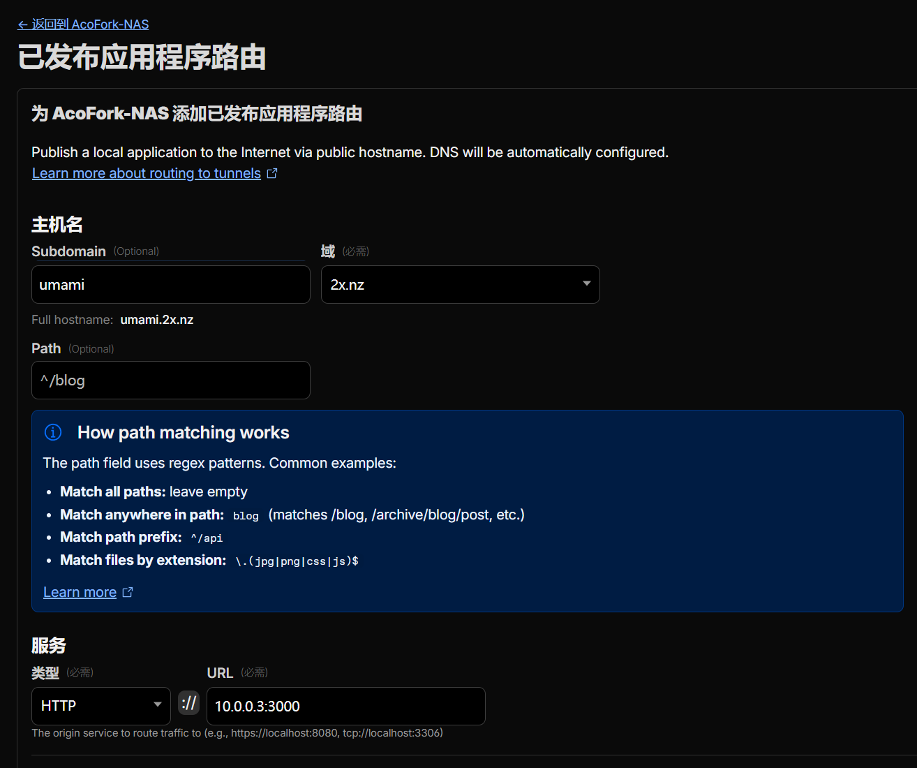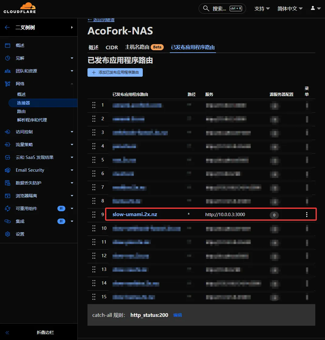 接下来我们需要让 最终访问的域名 打到 Cloudflare Tunnel 的流量正确路由,否则访问时主机名不在Tunnel中,会触发 catch: all 规则,总之就是没法访问。再创建一个Tunnel规则,域名为 你最终访问的域名 ,源站指定和刚才的一致即可。