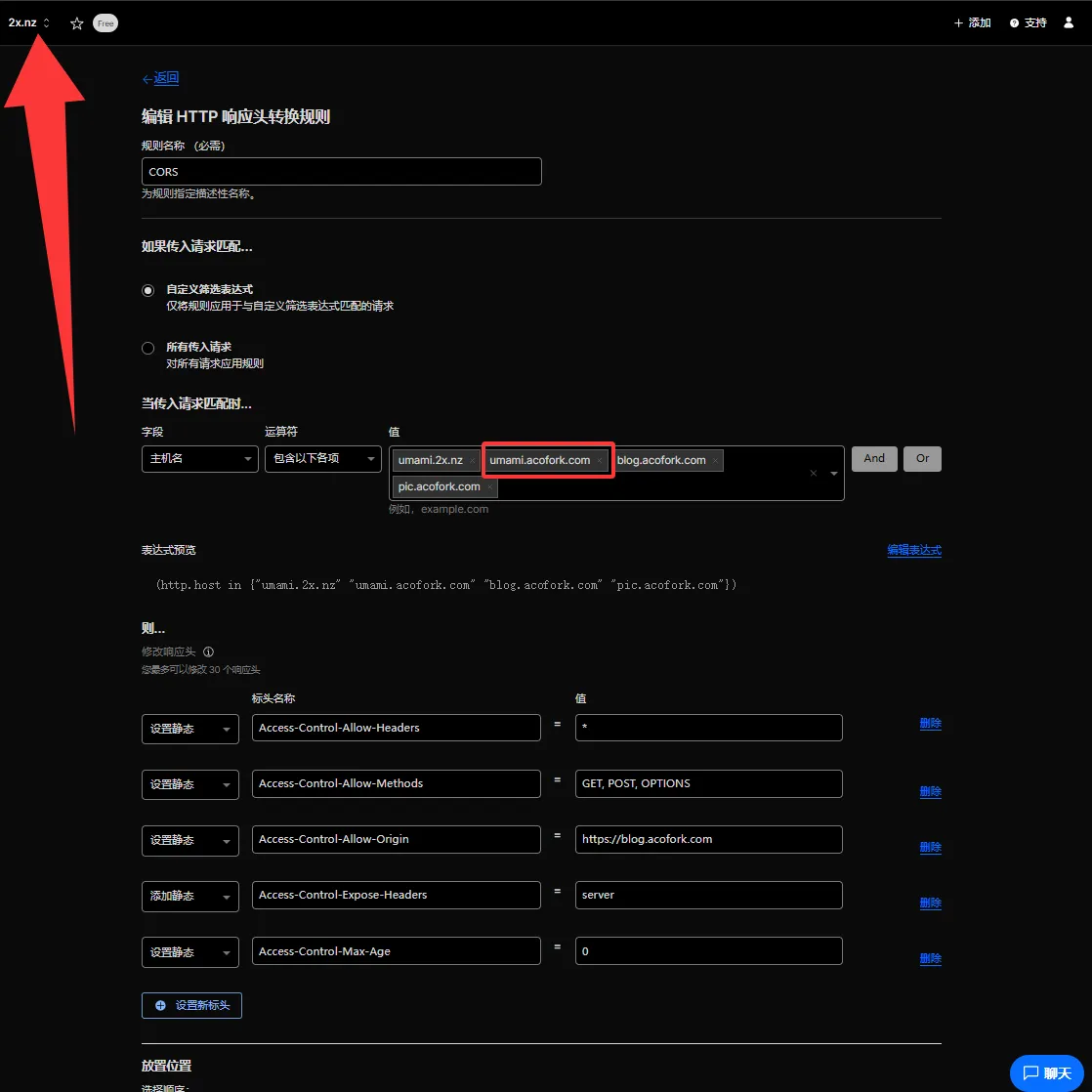 当一个域名被SaaS到一个已经在Cloudflare的域名后,它就完整受益所有Cloudflare服务。如我将 umami.acofork.com SaaS 到 2x.nz,我就可以在 2x.nz 里为 umami.acofork.com 写规则了: