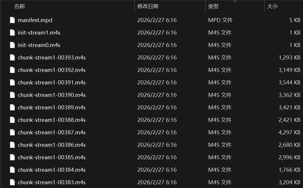 接下来,我们就能得到产物: 一个 .mpd 和一堆 .m4s
