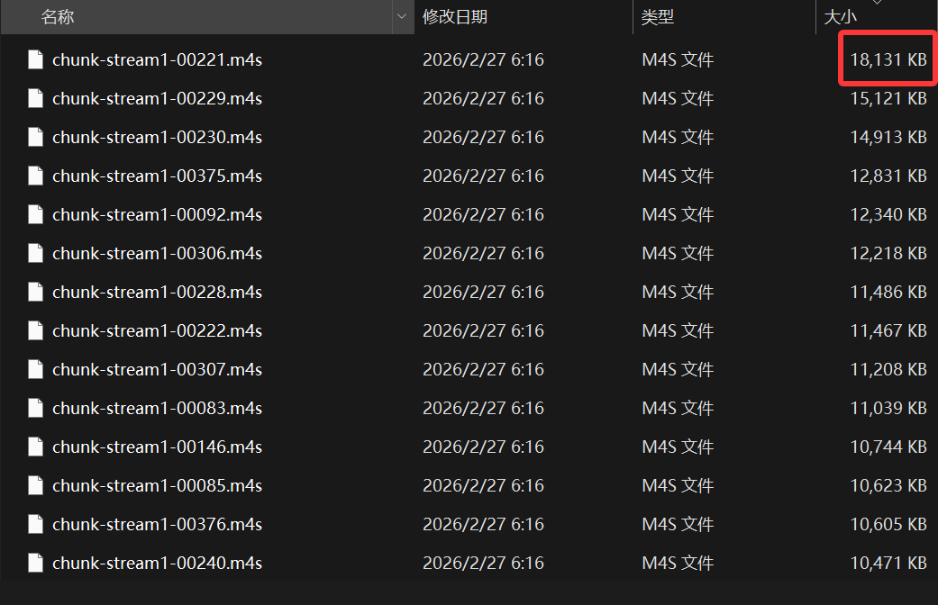 改为按大小排序,可以看到其中最大一个切片也才 ≈ 18MB,完全符合Cloudflare所规定的单文件最大25MB的规定