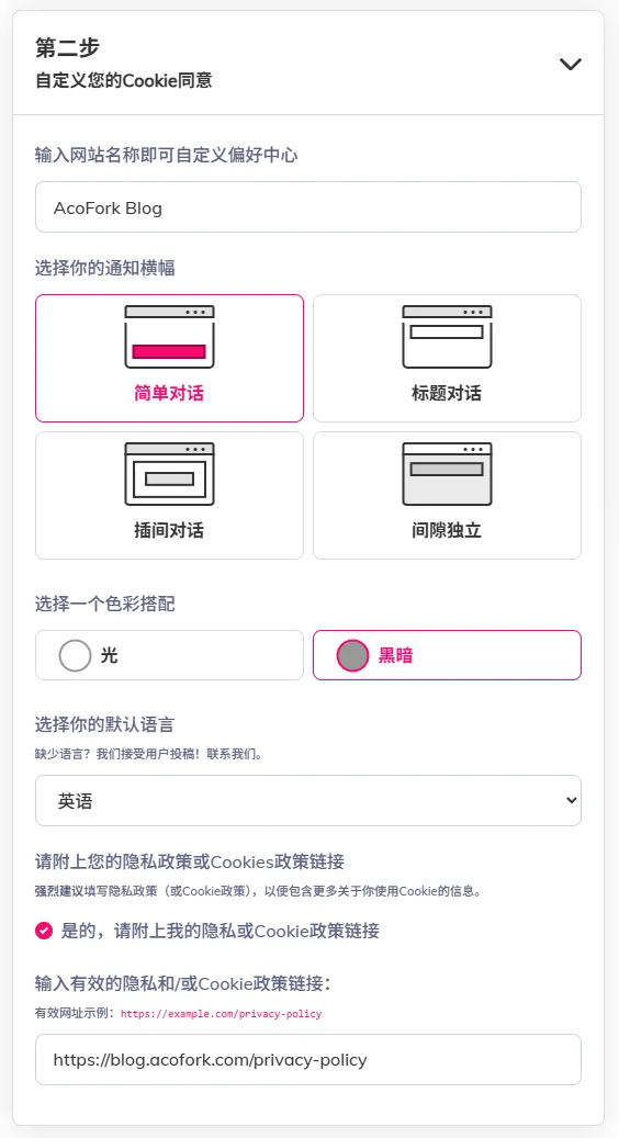 第二步,设置网站名称,布局样式以及提供您的隐私政策页面