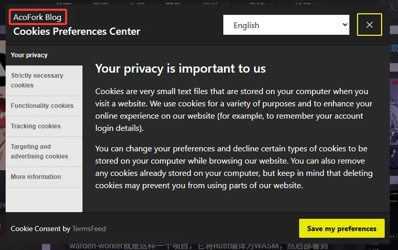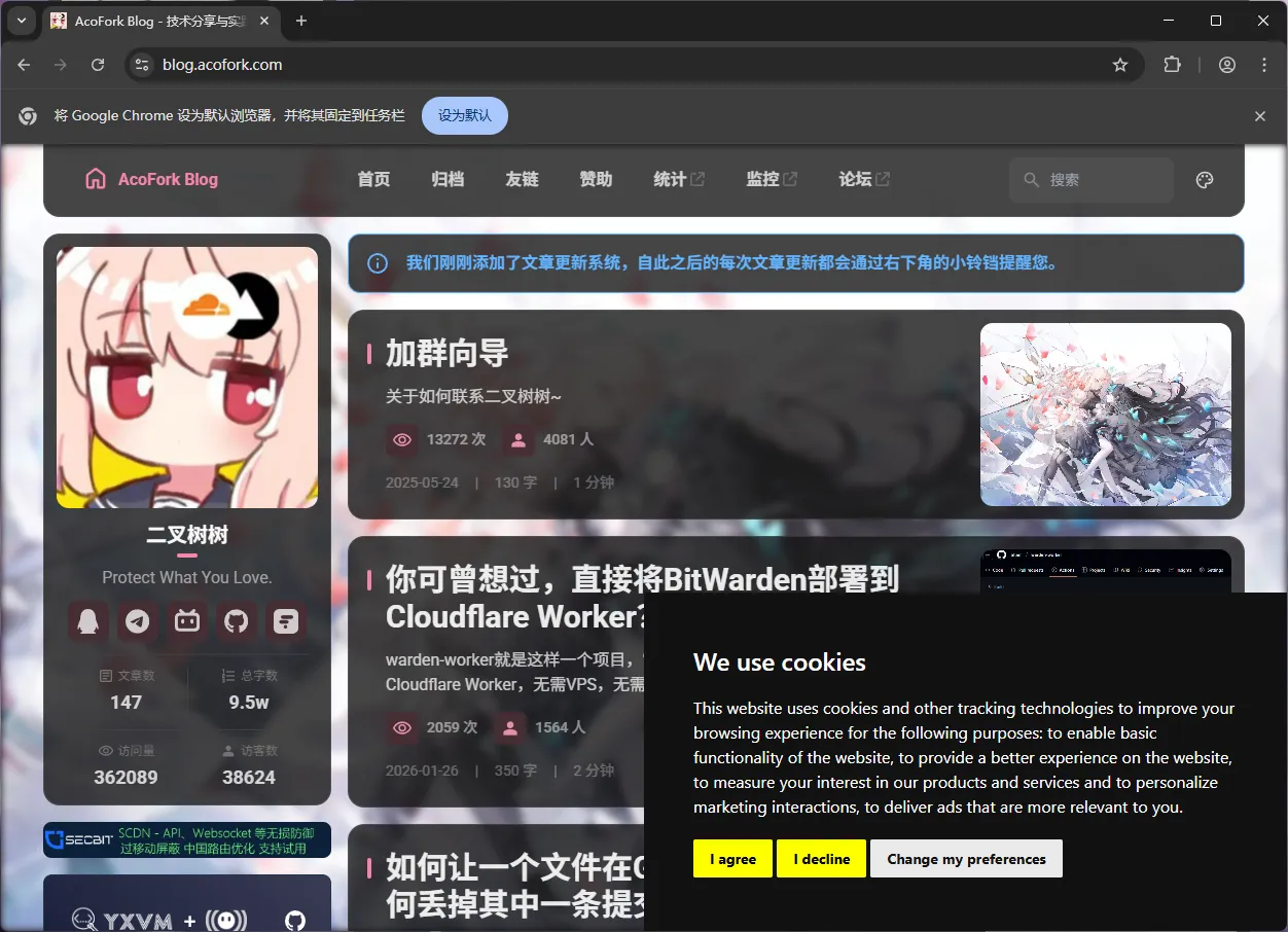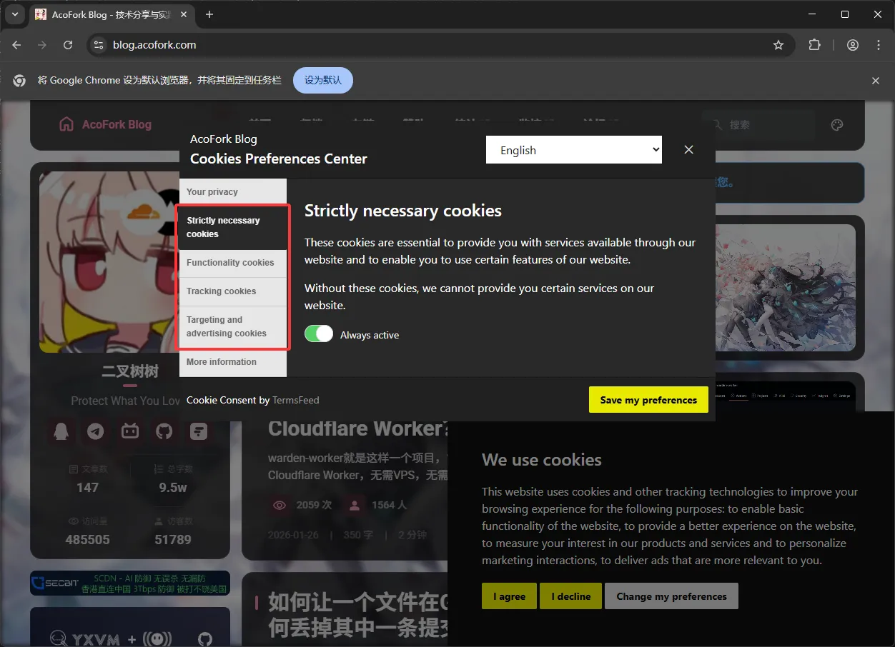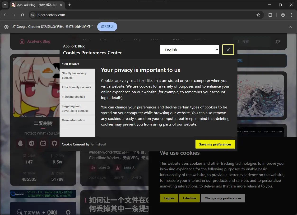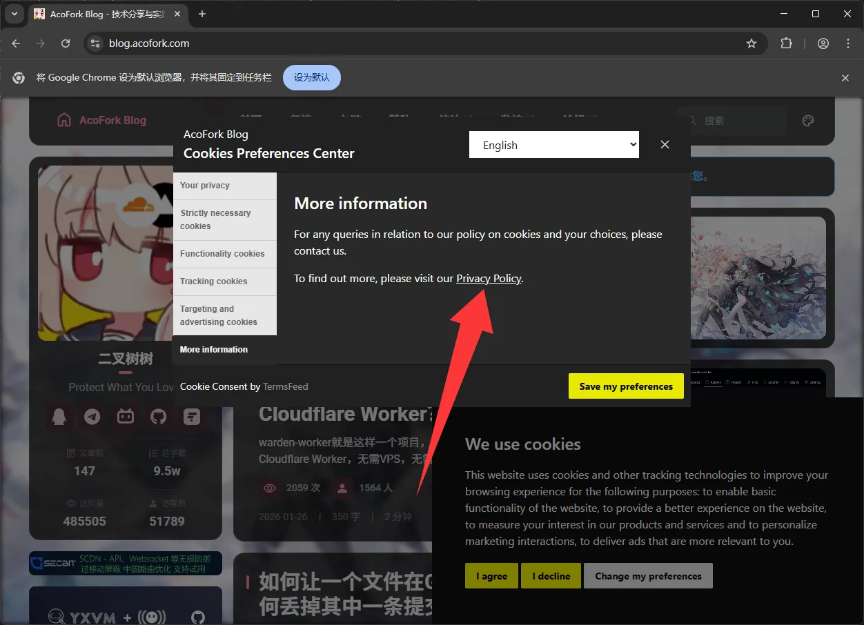 当用户第一次访问时,会弹出是否允许Cookie的弹窗。用户可以选择全部允许(I agree),全部拒绝(I decline)或高级配置(Change my preferences)