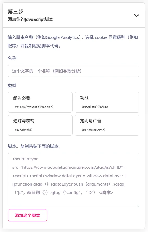 这里的名称仅会在最终代码中展示出来,站点访客仅能管理这四种类型是开是关(这也是为什么上文说你几乎配置一个隐私政策页面,否则用户根本不知道这四种类型分别对应着什么),其中,第一个类型是必开的,所以你可以在其中放入一些不运行这些JS网站就不正常的脚本(如评论区)