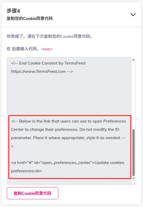 网站在提供的代码最后添加了一个特殊标签的按钮,也就是 id="open_preferences_center" ,你可以先将红框中的代码移除,否则可能会破坏布局,接下来找一个地方放置这个 编辑您的Cookie首选项 按钮,让用户可以轻松的更改Cookie首选项,而不是需要用户伪造一个按钮来手动触发这个id