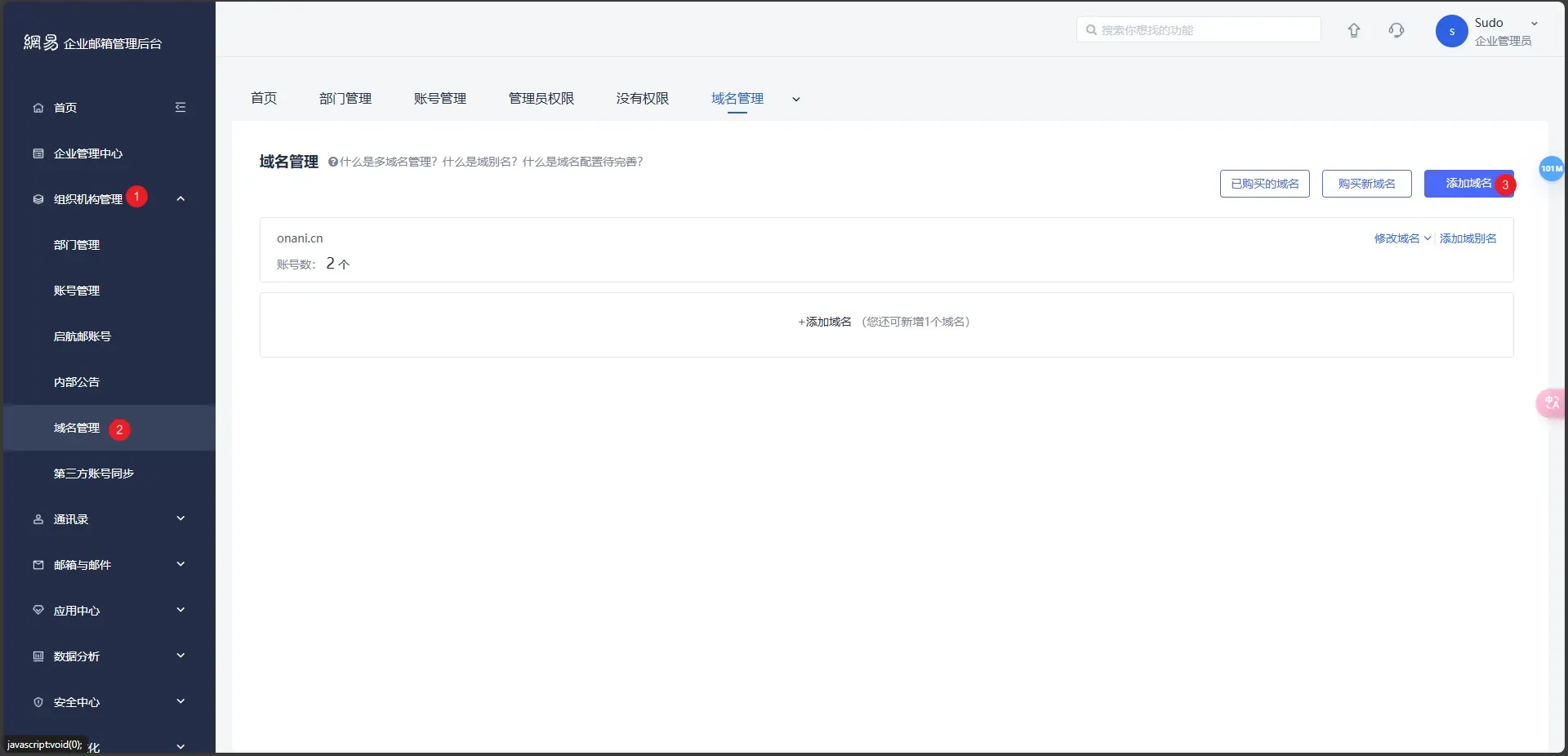 前往组织机构管理 - 域名管理 - 添加域名