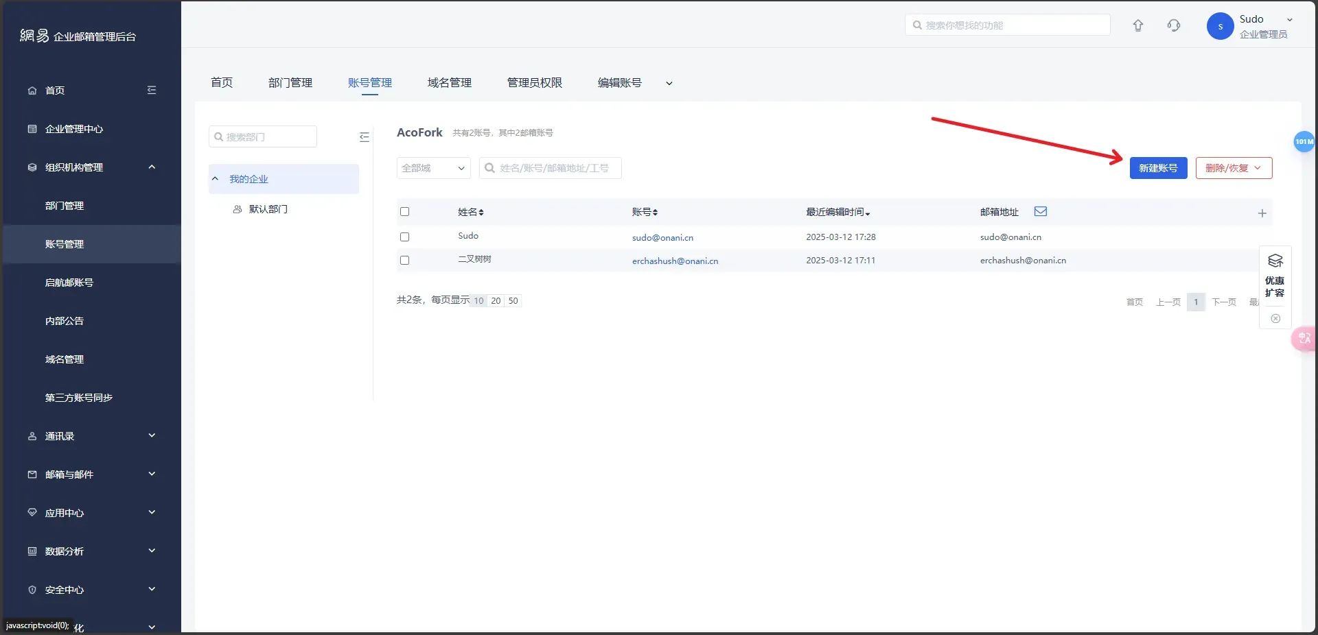 在组织机构管理中点击账号管理,选择新建账号