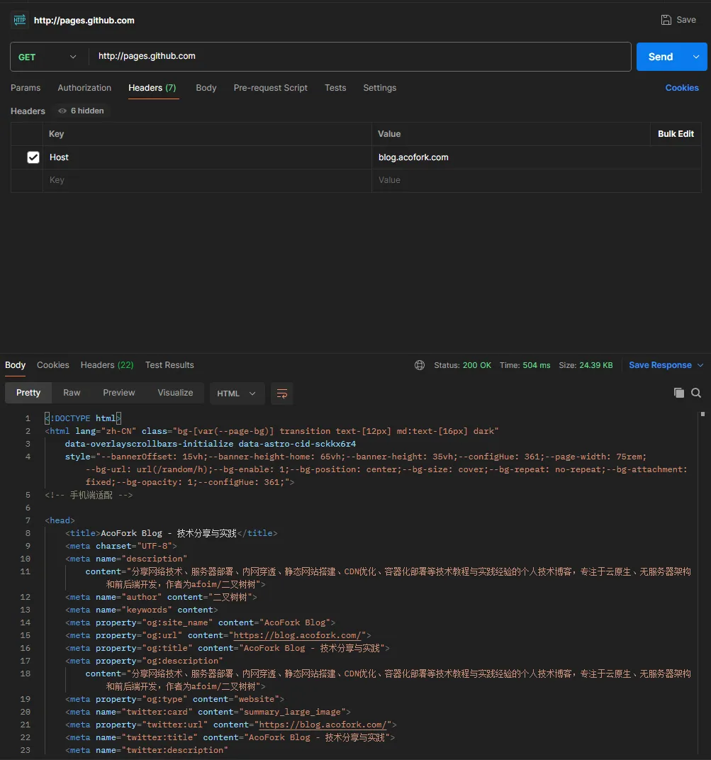 也就是说,对于海外CDN是否存活,我们可以通过直接访问CDN节点,如: http://blog.acofork.com.a1.initww.com 并携带上 Host 头指定为 blog.acofork.com ,从而强制指定节点访问业务网站,不走分流