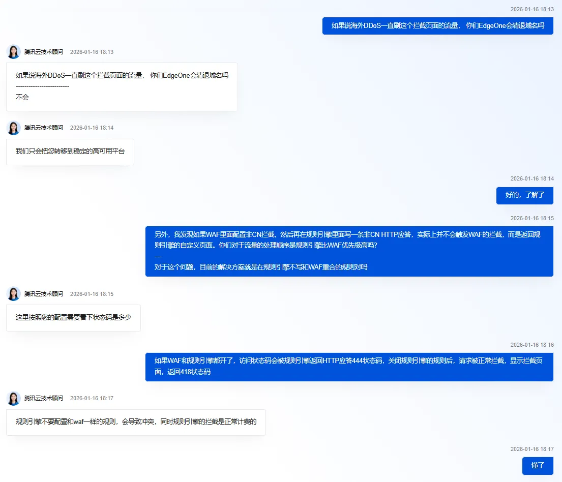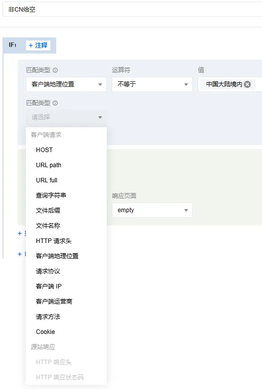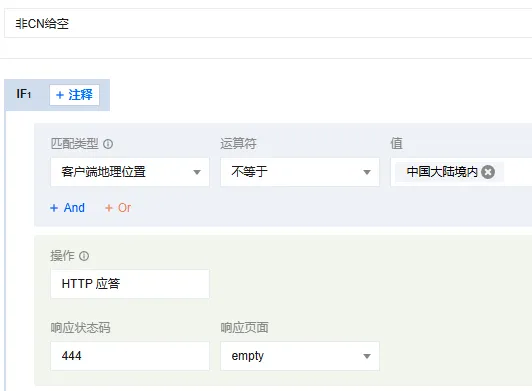 并且要注意一点,虽然你可以在规则引擎里伪装一个WAF拦截,但是在EdgeOne中,流量会先经由规则引擎,再经过WAF,也就是如果你在WAF写了个非CN拦截,然后在规则引擎里写个非CN给空,海外IP访问只能看到空响应,看不到拦截页面,流量也照记(难绷)。
