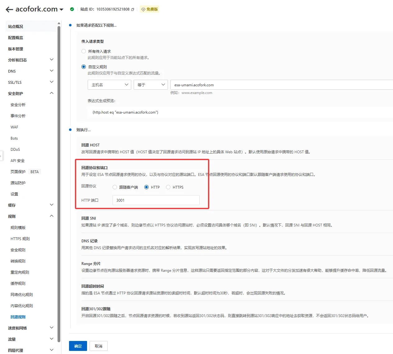 再接着就是因为ESA照抄Cloudflare,所以创建加速站点的时候默认是HTTP走80,HTTPS走443回源,如果你要更改回源的端口,还需要浪费一个回源规则。