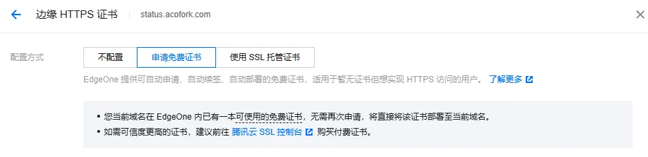 再到SSL签发,首先两家都支持默认的CNAME签发,也就是你把域名解析到我这,我帮你签SSL,但是EdgeOne的CNAME签发是每一个站点单独签一次。