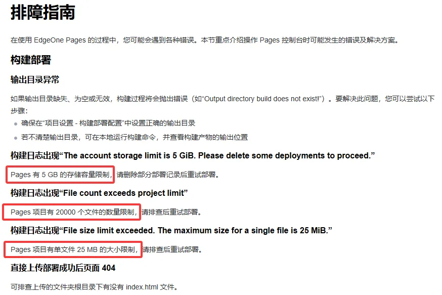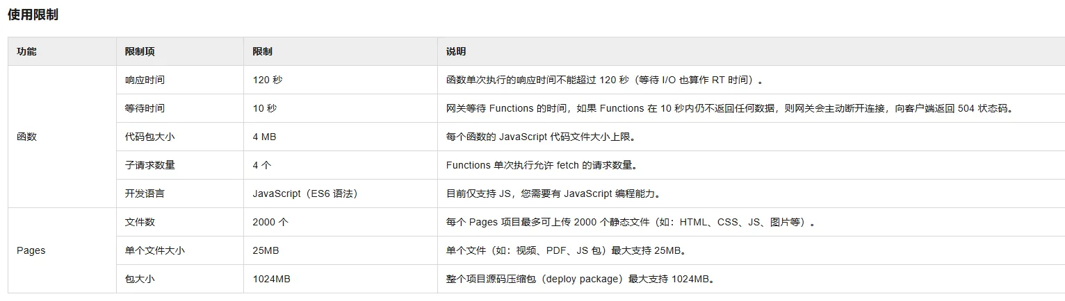 而ESA Page非常像云函数FC改过来的,虽然也支持函数吧,但没有完整的Nodejs环境,甚至最近WebSocket也被砍了(关闭后就打不开了),并且托管的文件数以及单文件大小如下限制。