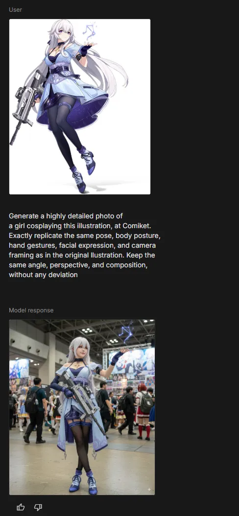 立绘中角色不要做出现实中无法做出的动作,这可能会触发AI的Copy,会将图片完整的复制过来而不是创建一个Coser