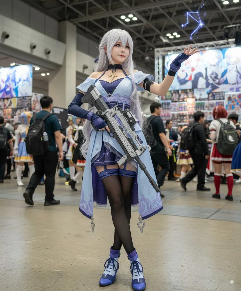 The entire environment (restaurant interior, people, cosplay) must look like a natural camera photo.