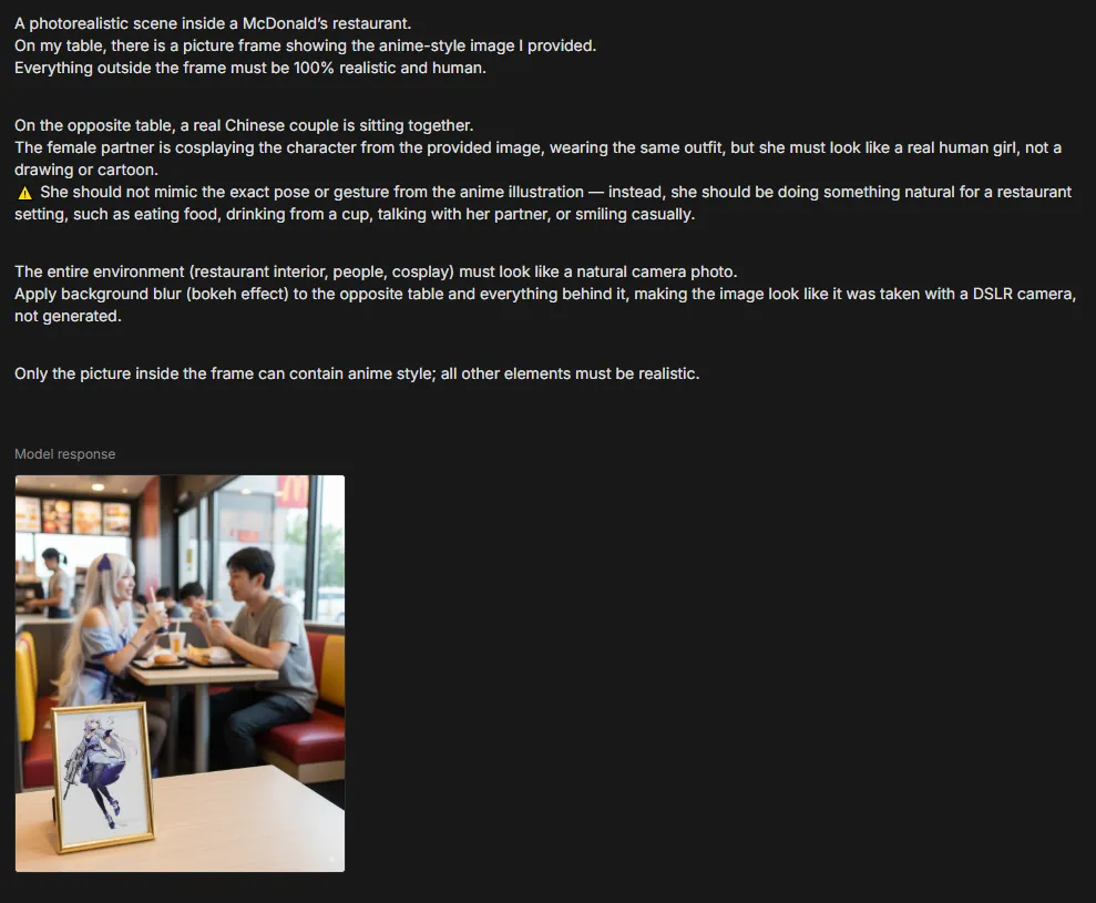 ⚠️ She should not mimic the exact pose or gesture from the anime illustration — instead, she should be doing something natural for a restaurant setting, such as eating food, drinking from a cup, talking with her partner, or smiling casually.