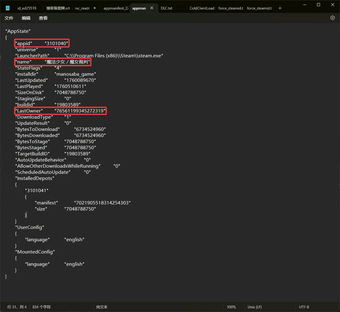 编辑 force_steamid.txt 填入上一步获取的 LastOwner 字段的值
