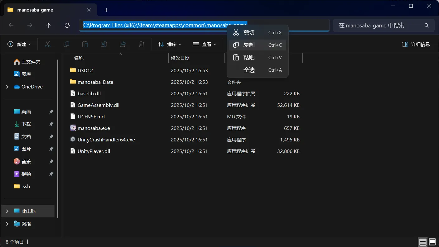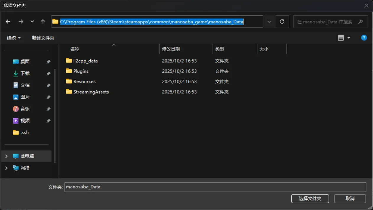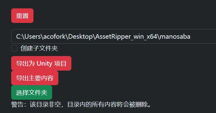 此时在 AssetRipper 中我们选择 文件 - 打开文件夹 并粘贴路径,并进入 *_Data 文件夹,这里为 manosaba_Data