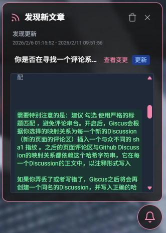 此前,我们给博客加过一个文章更新提醒功能,也就是右下角的小铃铛图标。它可以通过比较你上次访问和这次访问之间的差异,给出醒目的提示,并告诉你哪些文章发生了更新、更新了什么内容。