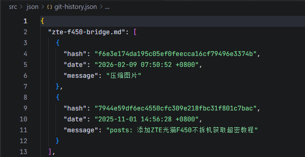 因此,我们完全可以在网站构建阶段增加一道处理流程:读取 Git 提交历史,生成文章更改索引文件,再把它放进最终产物中。