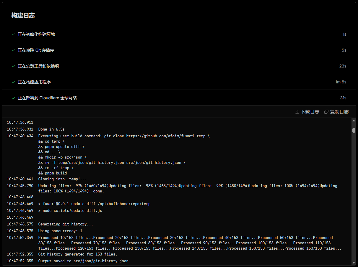 由于 Cloudflare Worker 默认克隆到的仓库没有提交历史,所以我们就额外再克隆一个带完整历史的仓库,在里面生成文章 diff 索引;随后把这个索引文件复制回 Cloudflare 自动克隆的仓库,再清理掉临时仓库,最后执行原本的构建命令。