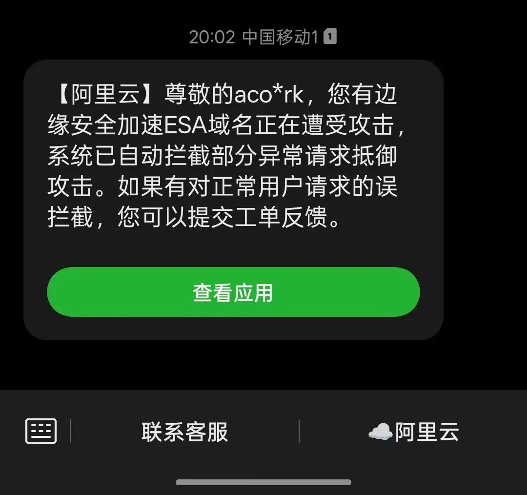 随后我抱着好奇的心态想看看ESA防御咋样,没想到刚切过去阿里云就给我发消息了