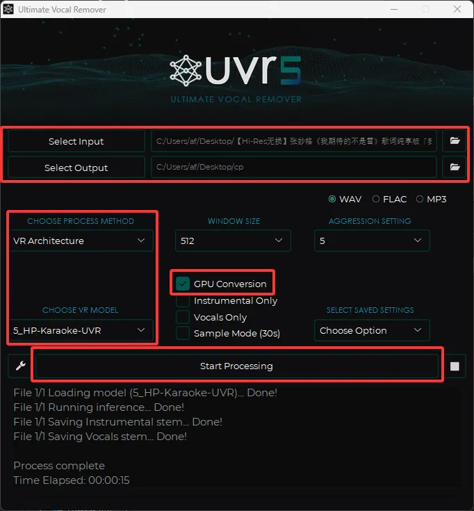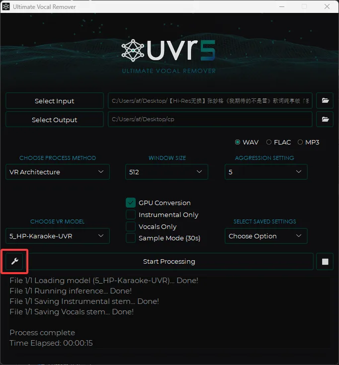 CHOOSE VR MODEL 选择我们刚刚下载的 5_HP-Karaoke-UVR 模型