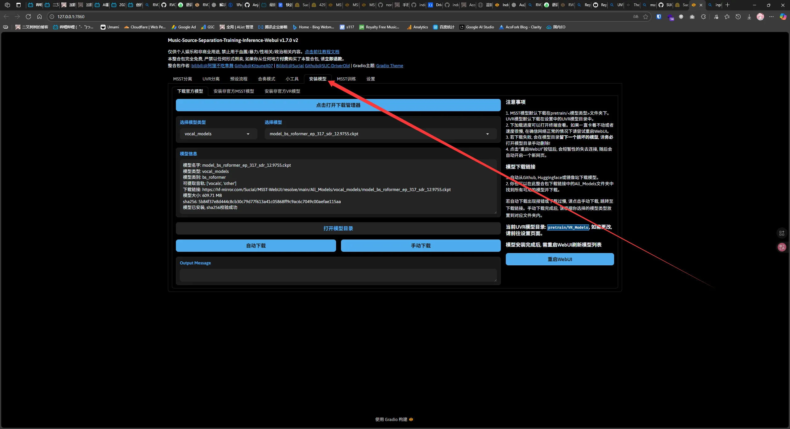 选择 Download Center 下载 VR Arch 的 5_HP-Karaoke-UVR 模型。然后回到首页