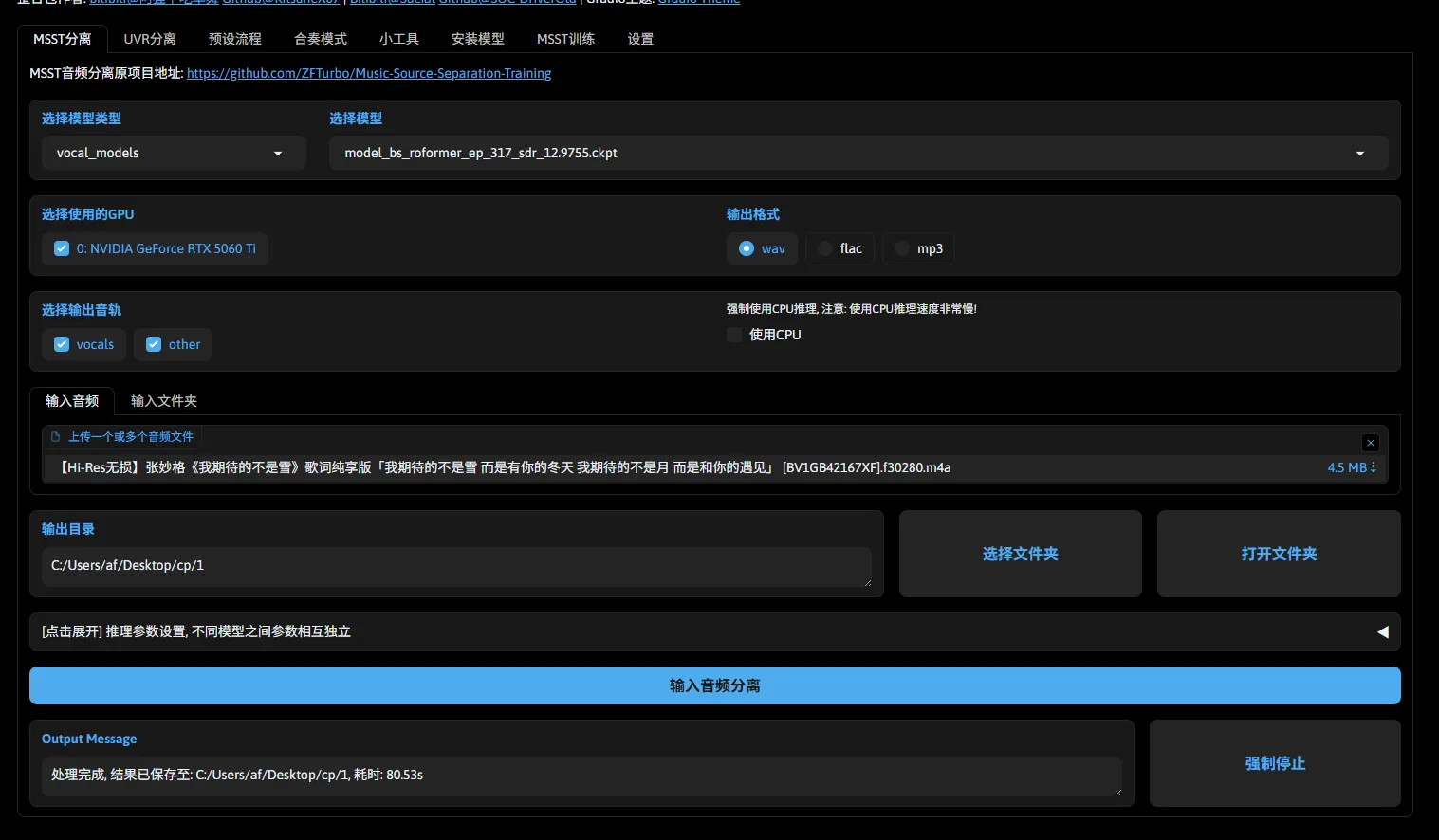 然后都是字面意思了,随后点击 输入音频分离 开始转换