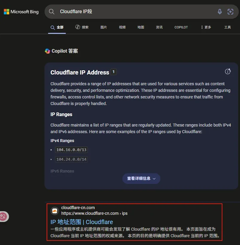 首先我们要知道一个CDN厂商的IP段是什么,这里以Cloudflare为例