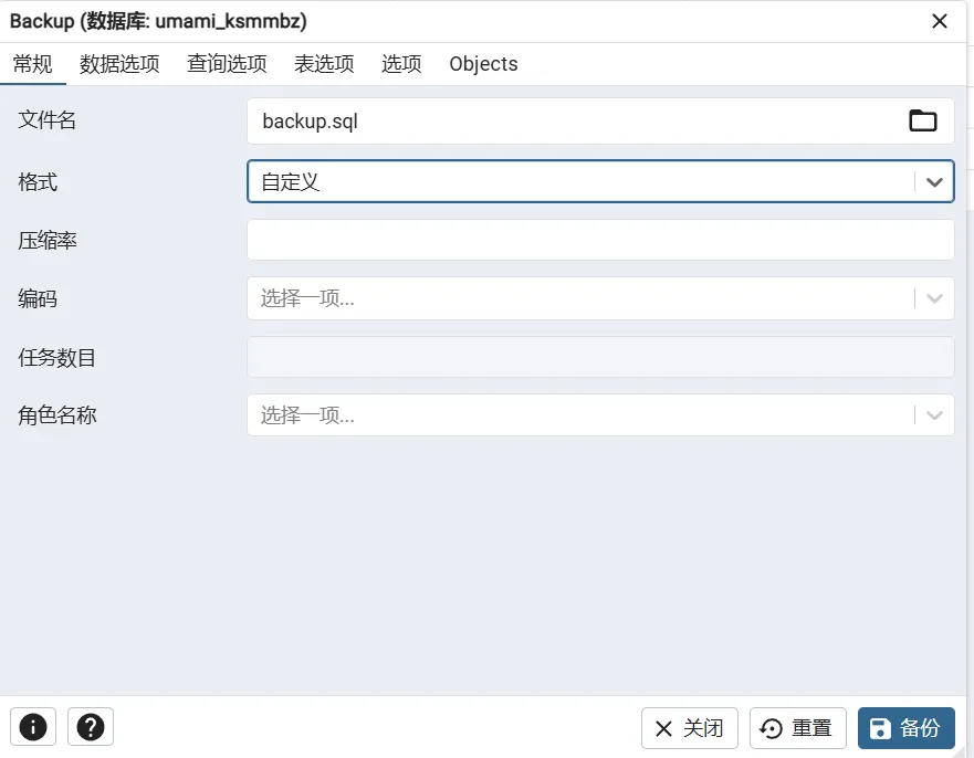 填写 文件名 创建备份。备份的文件将会保留在 pgAdmin4 上