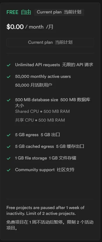 免费计划有 500MB 免费的数据库空间,完全够用了
