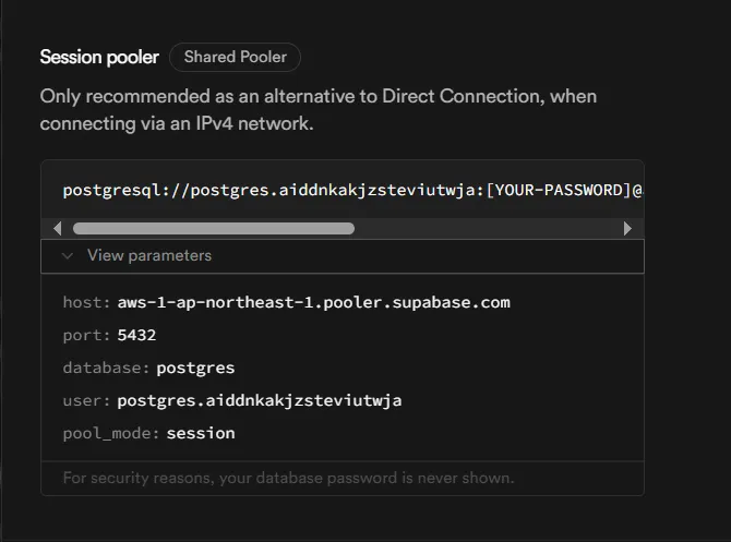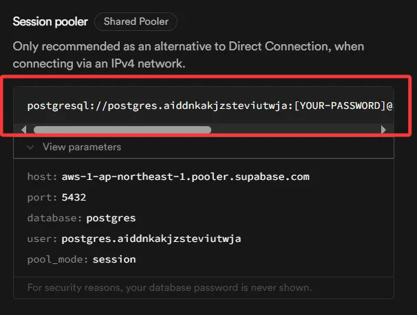 其中的 [YOUR-PASSWORD] 可以在 Supabase 的数据库设置中进行重置