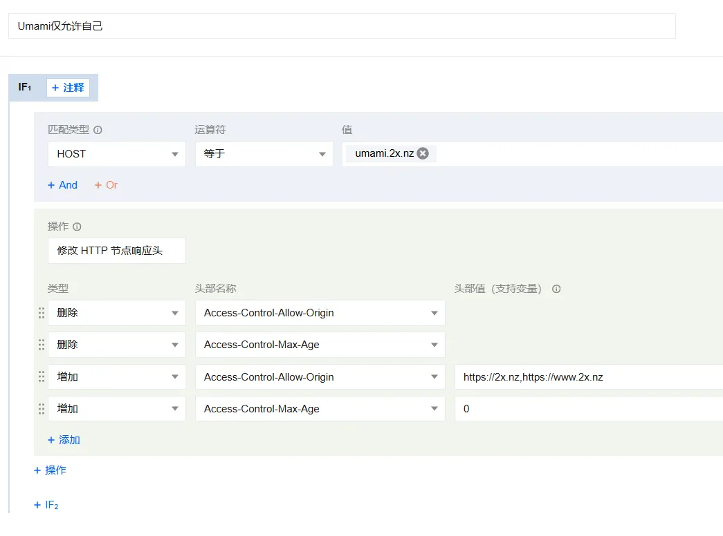 由于 Umami 没有独立的CORS设置,如果不设置CORS则他人将可以随便刷你的Umami,这会导致统计不准确,详见 这篇文章 。我们可以接入EdgeOne CDN来变相支持CORS