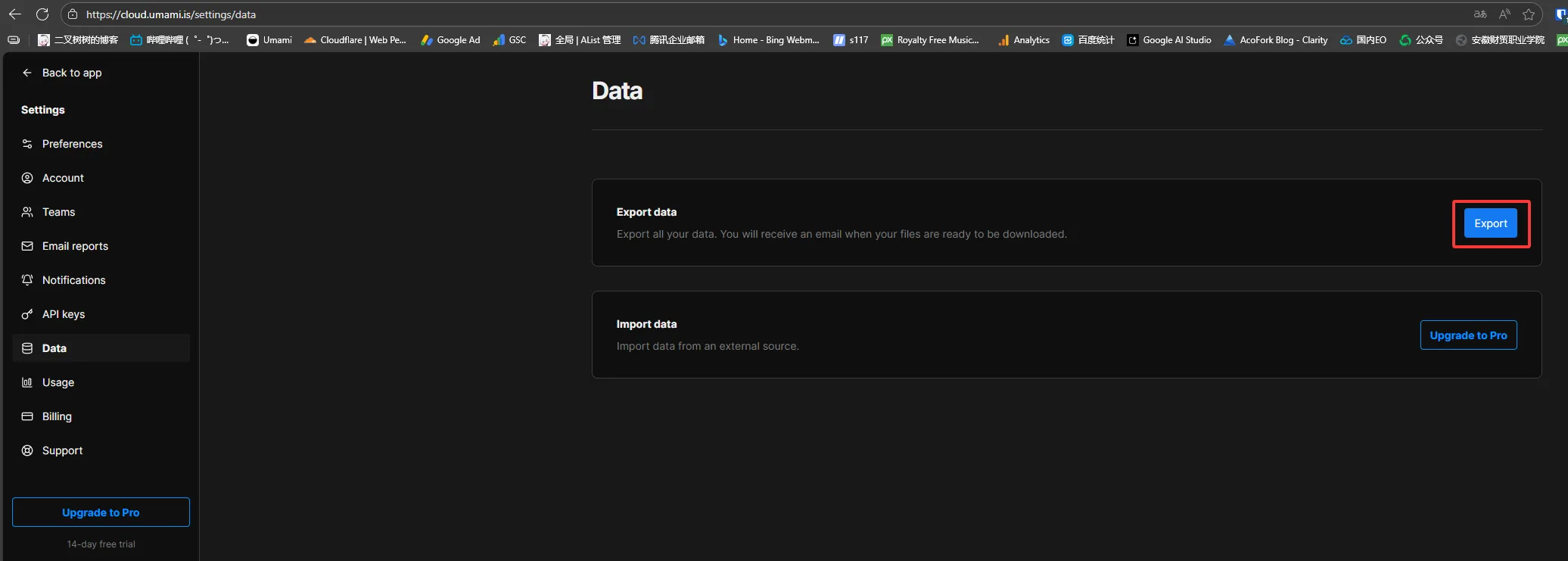 在 Umami Cloud Data | Settings 中,我们可以选择,导出数据(Export)