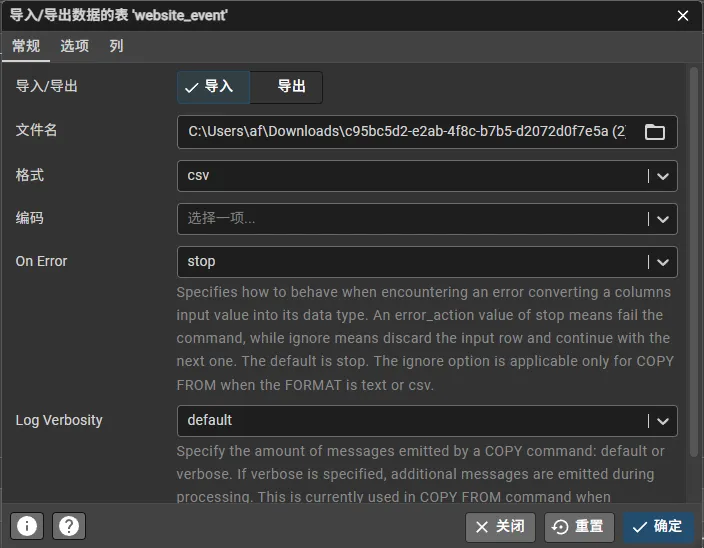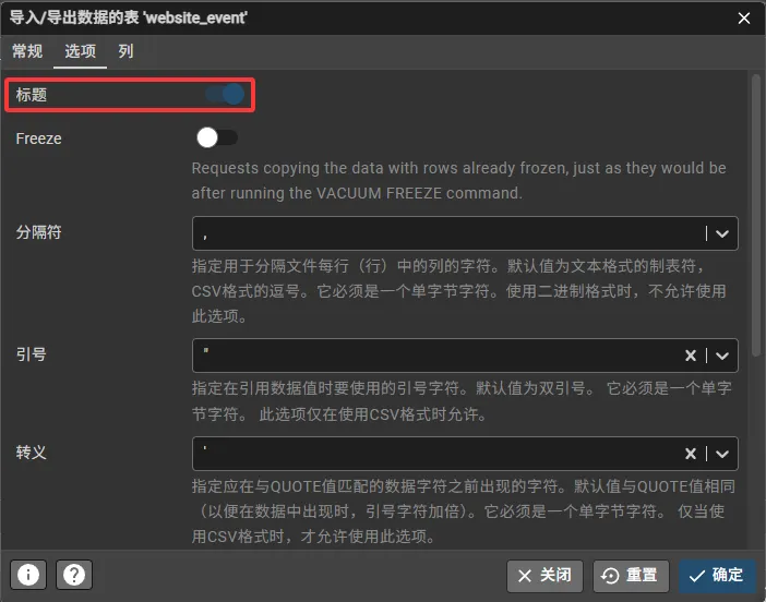 确保数据库中的表头顺序和CSV文件中的表头顺序一一对应,顺序一致,不多不少后,Ctrl + S 保存 CSV文件,我们开始导入并在选项中勾选 标题