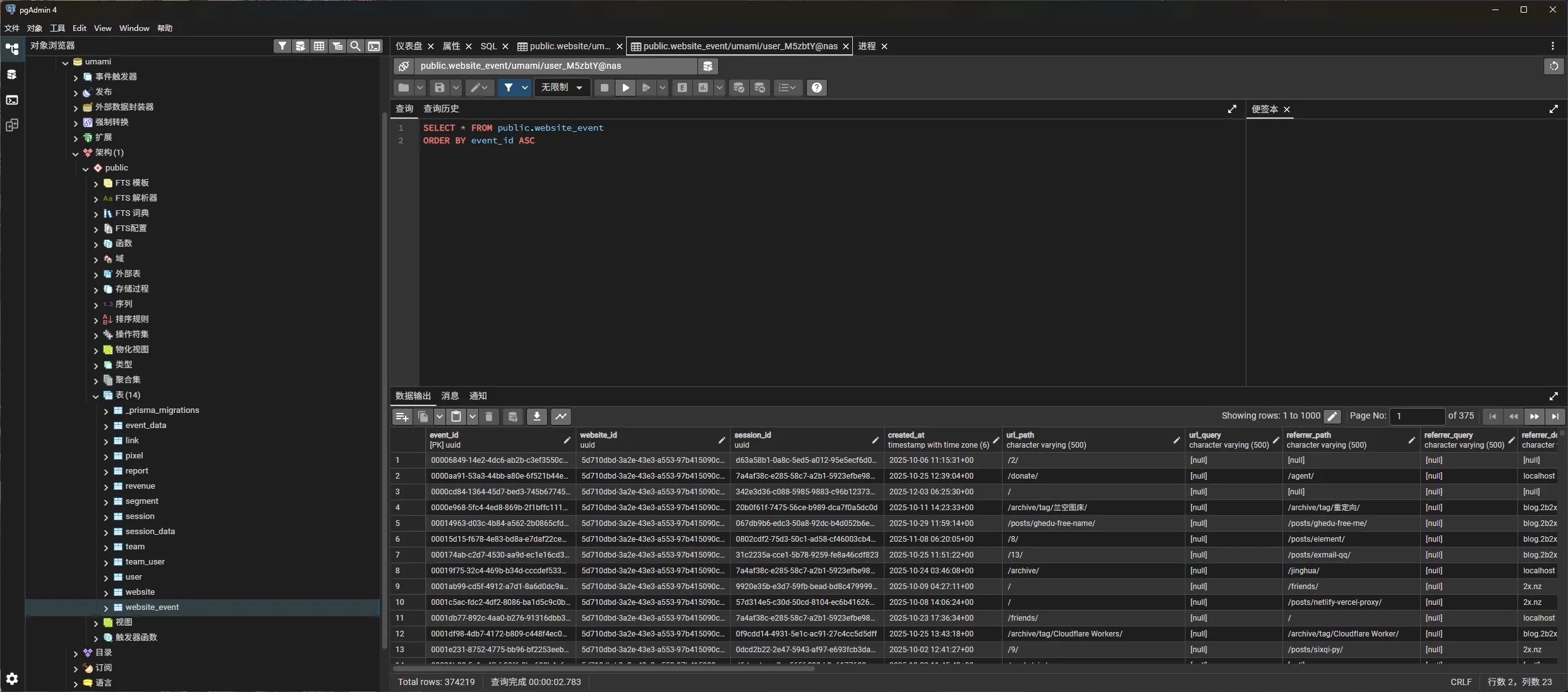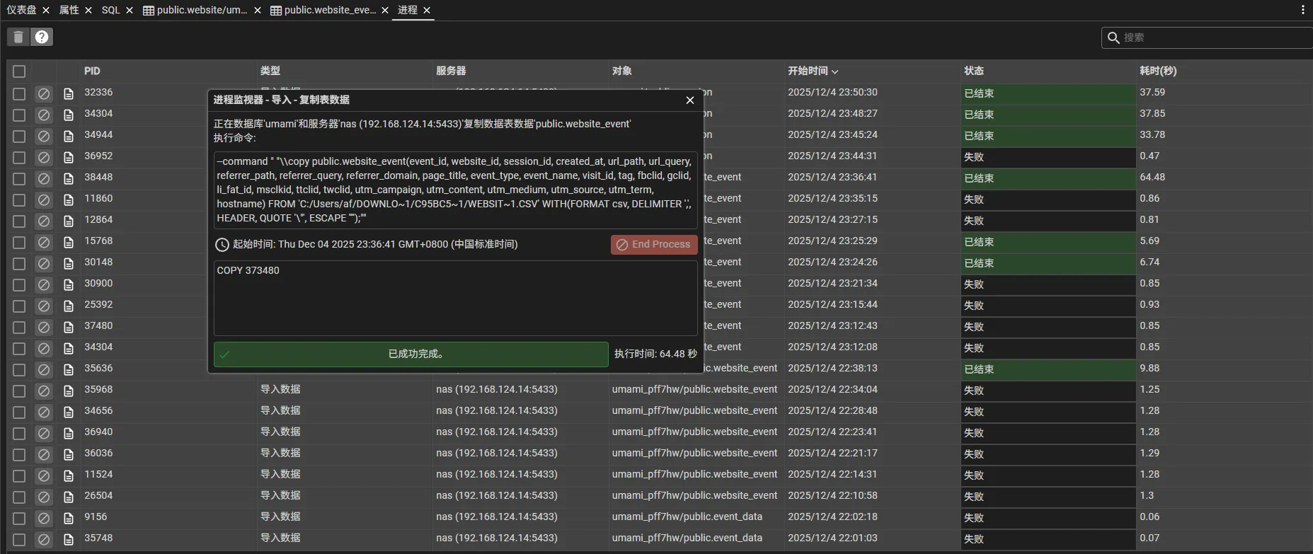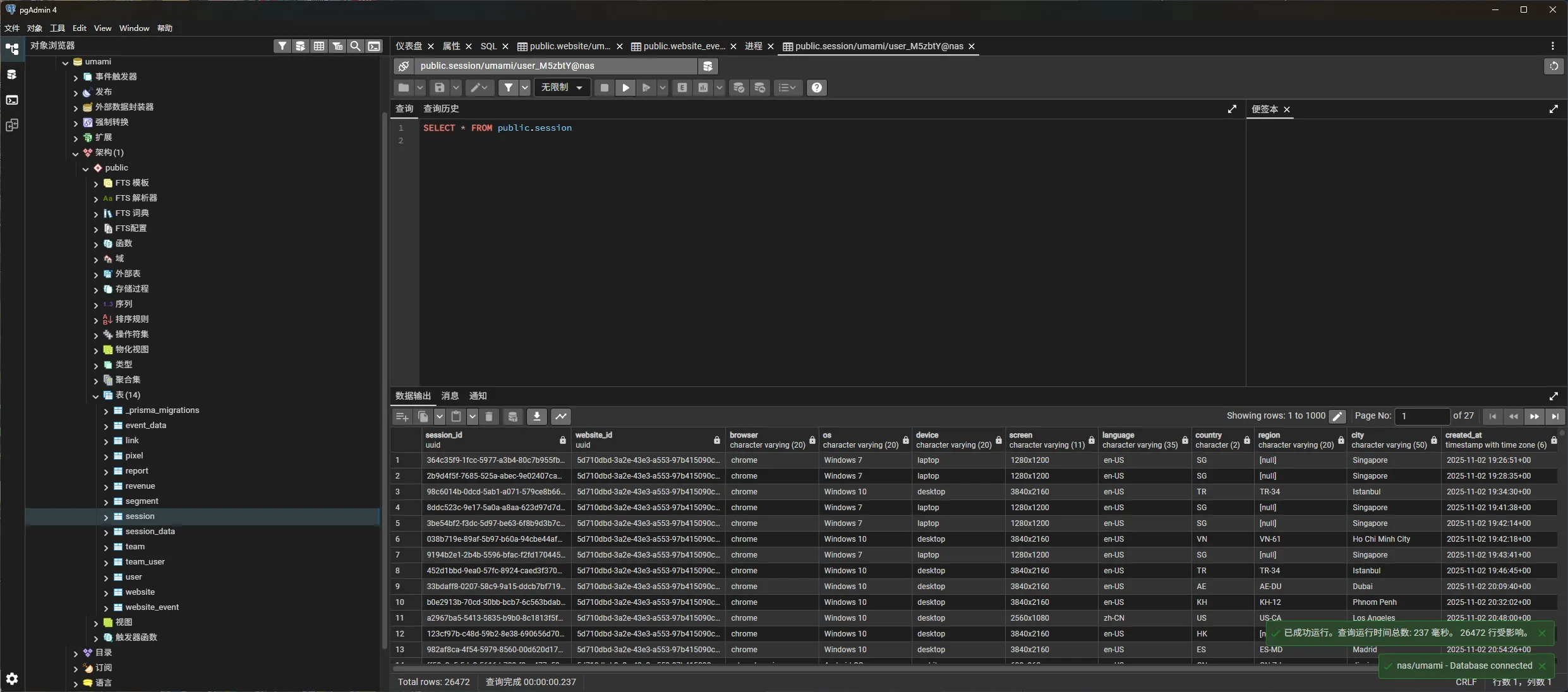 接下来,我们正式开始数据导入,由于导入后的数据有两个 session_id 字段,而在Umami自我管理的过程中这个 session_id 字段是 唯一约束的 ,我们需要先解除这个限制,在正式上线前还要再加回这个限制(后面会说)