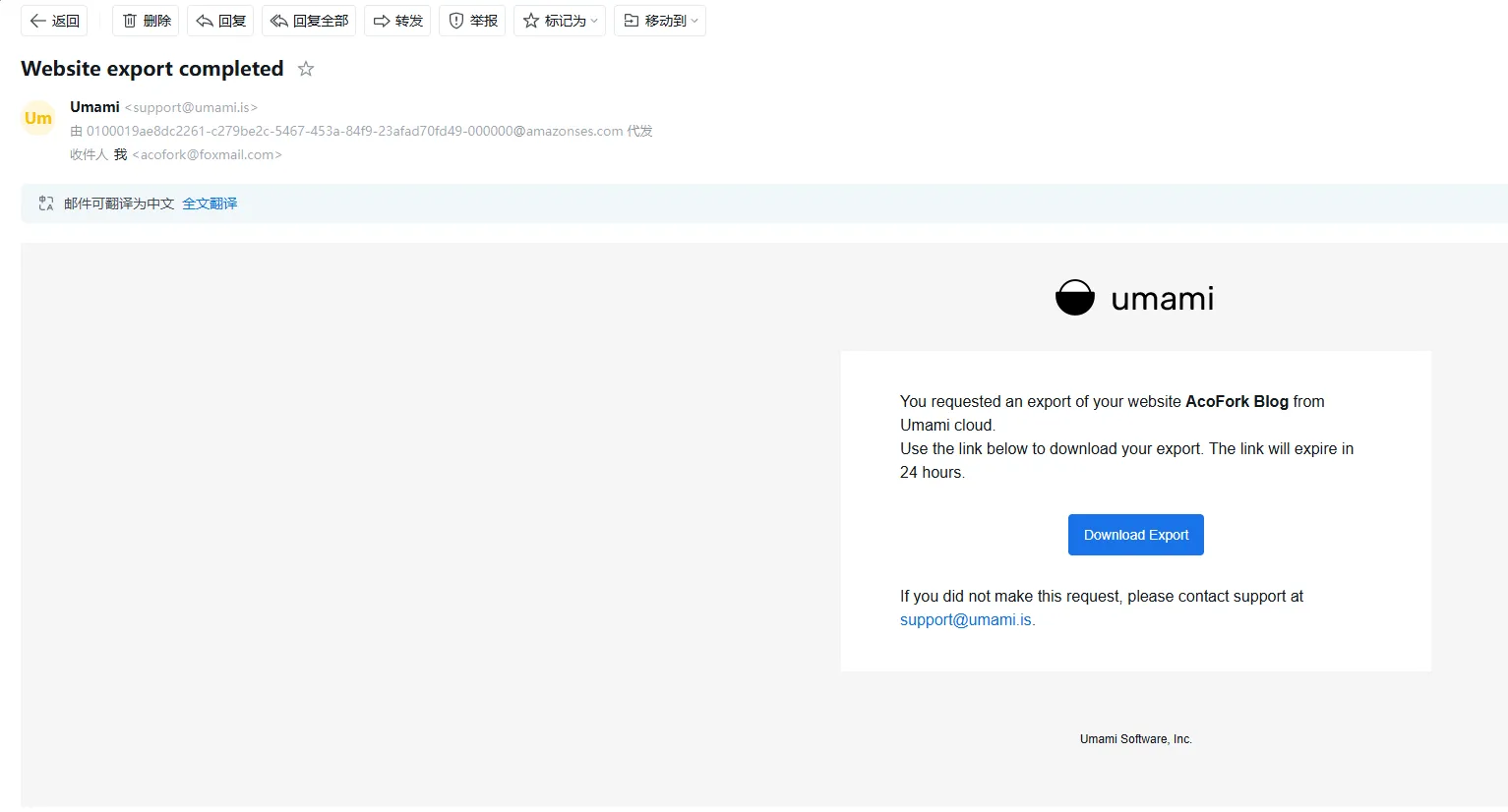 当数据准备好后(几分钟左右),你的邮箱会收到一封Umami Cloud发来的邮件