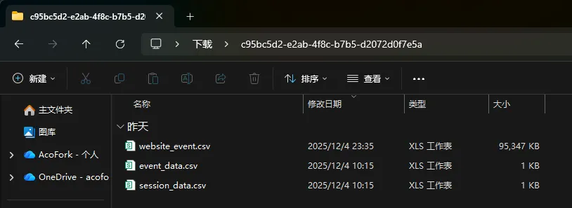 下载下来的文件是一个以UUID命名的ZIP压缩包,将其解压可以得到3个CSV文件