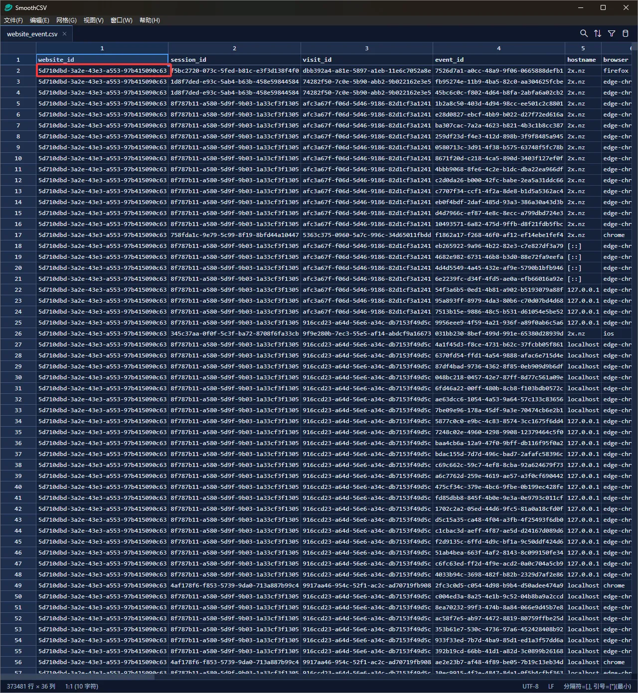 接下来我们查看 website 这张表,将 website_event.csv 打开,查看旧的 website_id 将新的ID改为旧的,这样才能数据匹配