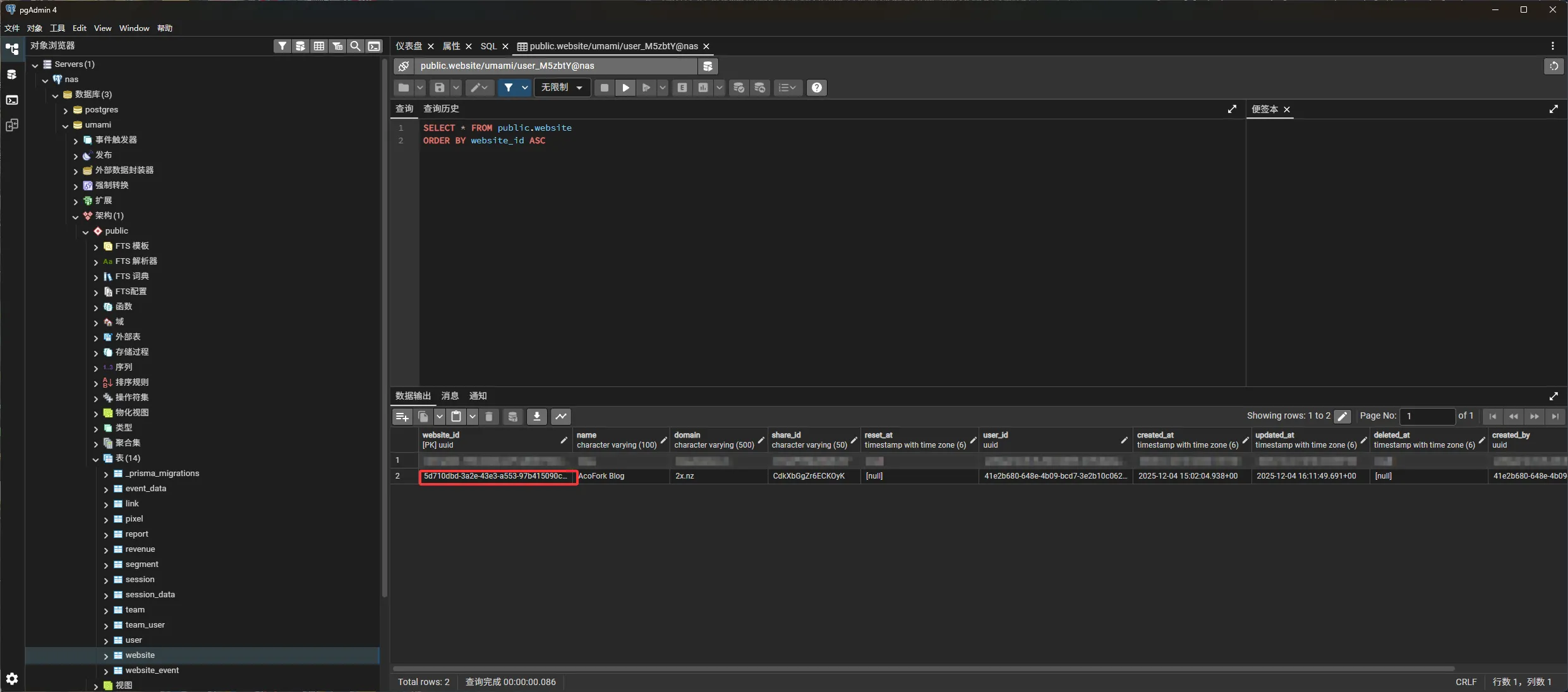 确保导入后数据无异常后,我们开始删除另一条 session_id 记录并回锁主键。否则上线后Umami将无法再向表中插入数据